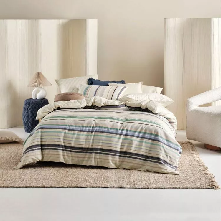 Linen House’s Withington quilt cover set offers a timeless aesthetic with yarn-dyed stripes on cotton. With a refreshing palette of blues, greens and greys, the quilt cover makes a perfect addition if you want to evoke summer in your spaces. Style this sublimely colourful set with a reverse print with coordinating European pillowcases and crisp white sheets to make it pop. Shop your bedroom style at Harris Scarfe today.