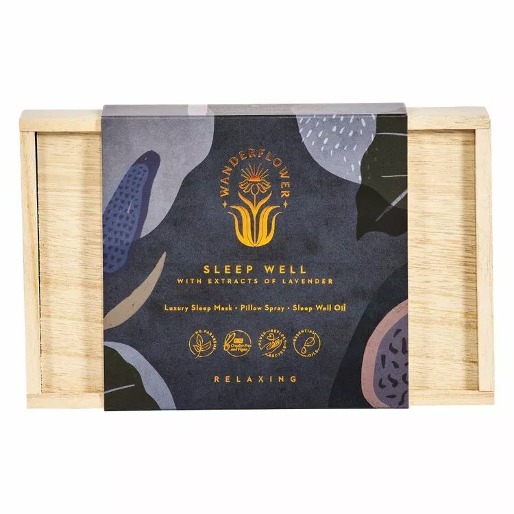 The Wanderflower Sleep Well Set is the perfect accessory to help those who struggle to fall asleep. With extracts of lavender infused throughout all items, it includes a sleep mask, pillow spray and sleep well oil. It comes assembled in a charming wooden box, making it both stylish and practical. Perfect for a much needed treat or pampering session, this set is also a delightful gift for friends and family.